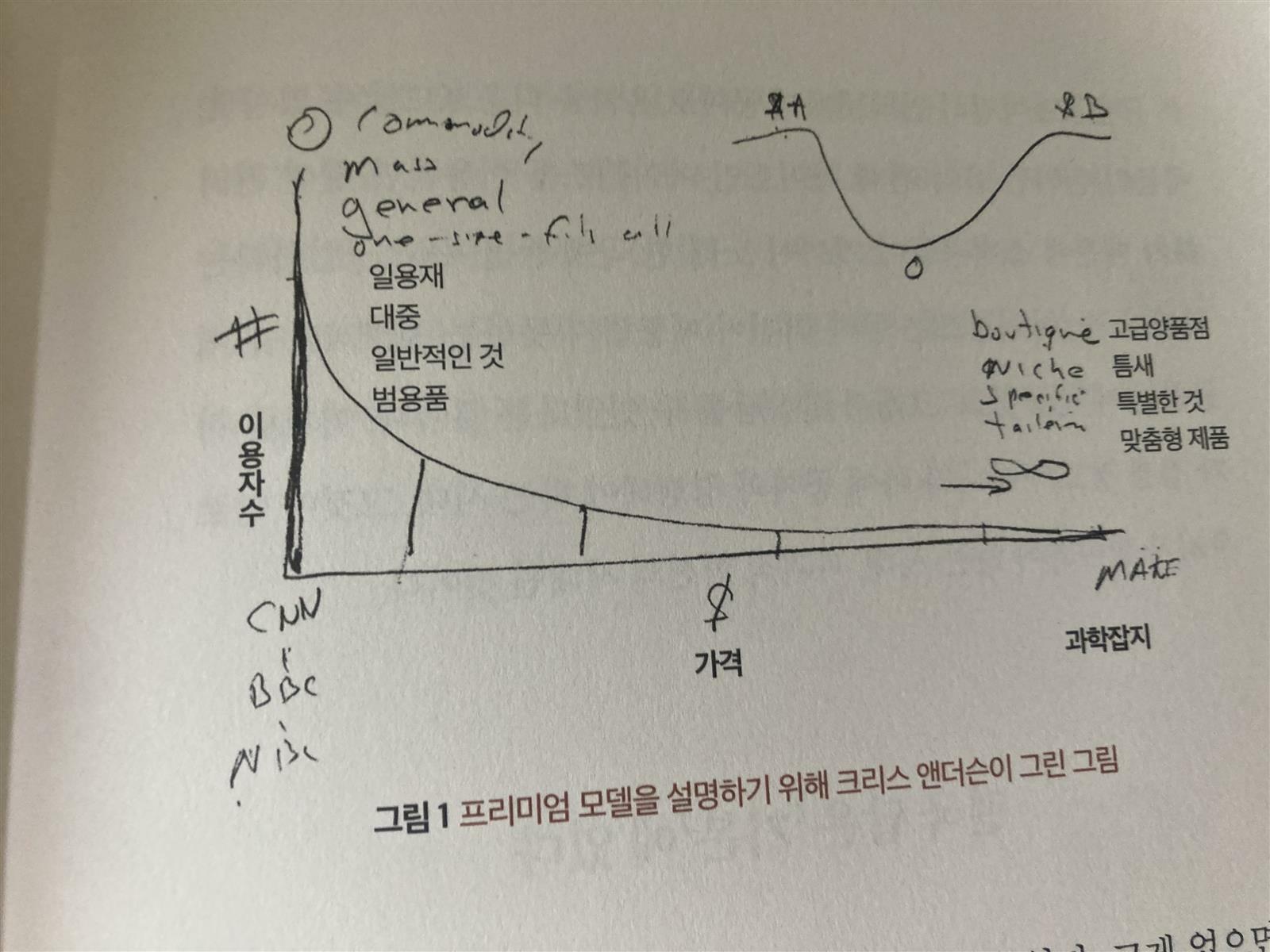 실제로 요즘 한쪽에서는 앤더슨이 말한 대로 공짜 상품과 서비스가 널려 있지만, 다른 한쪽에서는 수백만원짜리 핸드백과 자전거가 불티나게 팔리기도 한다. 이 역설에 대해 그는 종이에 그래프를 그려 자세하게 설명하고 있는 에더슨이 그린 그림을 만나볼 수 있다.