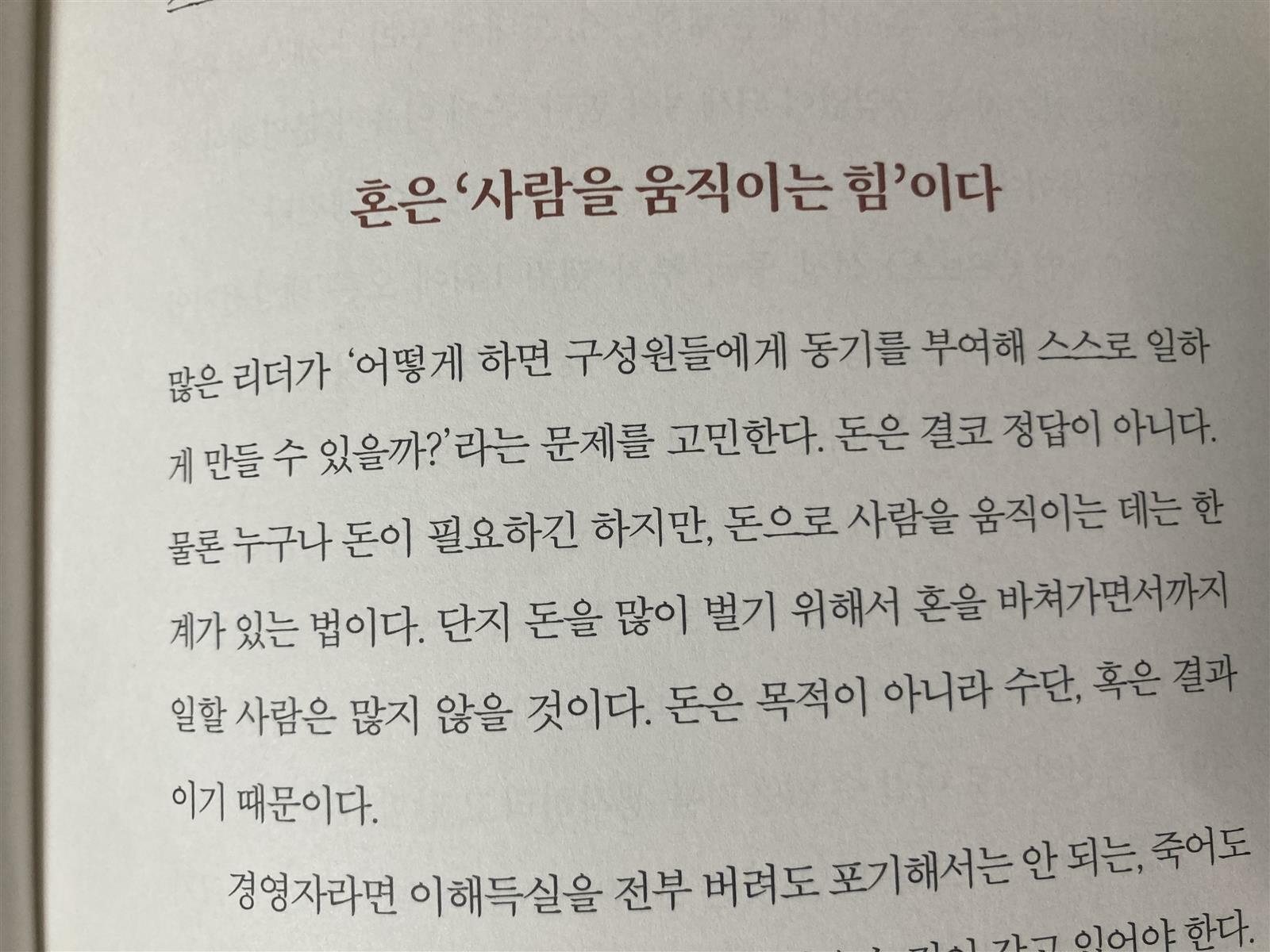무엇보다 크게 생각할 줄 알아야 하고 사업가라면 단순히 돈만 보지 말라고 얘기하는데 국가와 사회,인류에 봉사한다고 생각하고 사람을 움직일 수 있는 힘을 가져야함을 깨닫게 된다. 그동안 돈,돈,돈만 좇아온 나의 삶이 부끄러워지면서 사람을 움직일 수 있는 힘이 어떤것인가를 생각하며 혼,창,통으로 세상에 흘러보내는 사람이 되고 싶다.