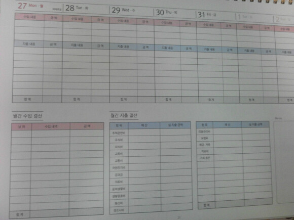 그날 그날 잊지 않고 바로 그날의 지출을 적어두고 또 행사를 적어 두면 예산도 잡을 수 있고