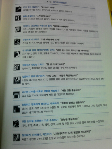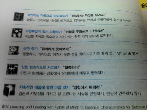 여기서 말하는 마음습관의 기본 요소란,,,포기하지 않고 끝까지 물고 늘어지기, 열린 마음으로 지속적으로 배우기, 상호의존적으로 사고하기, 유연하게 사고하기, 질문하고 문제제기하기 등과 같은 셩향이다