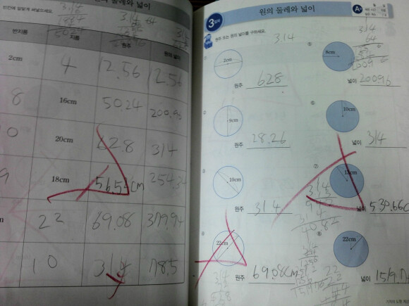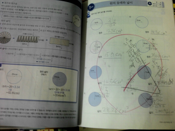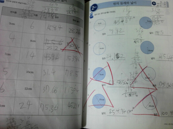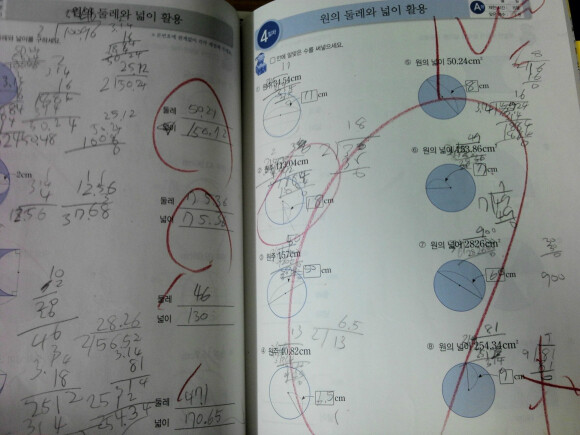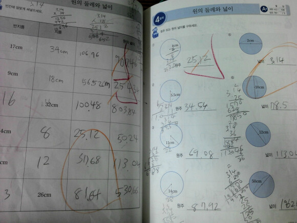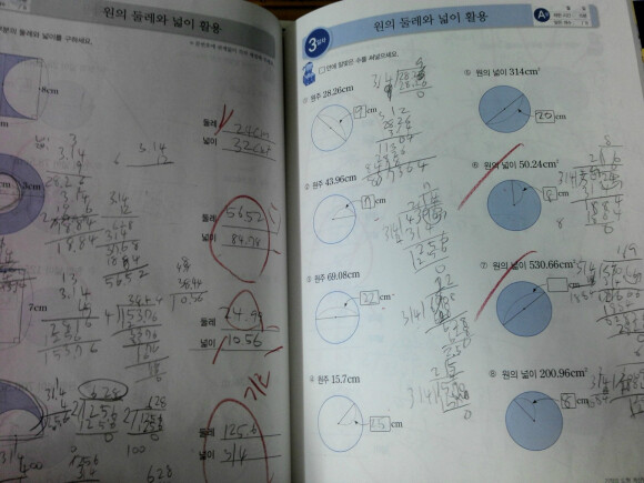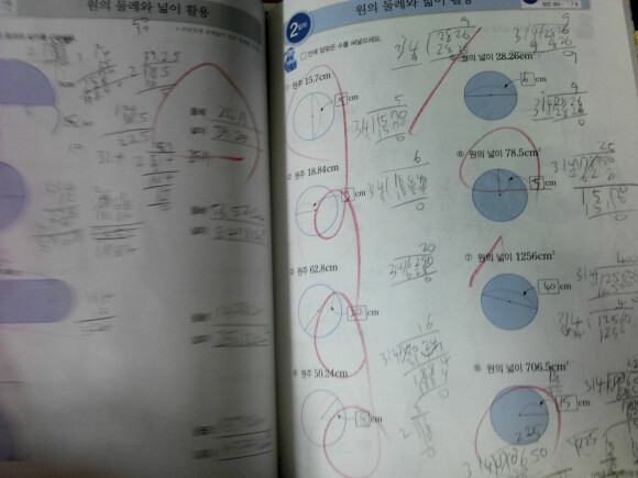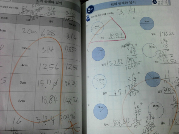 원의 둘레와 넓이를 활용해 문제를 풀어보고 있는 모습