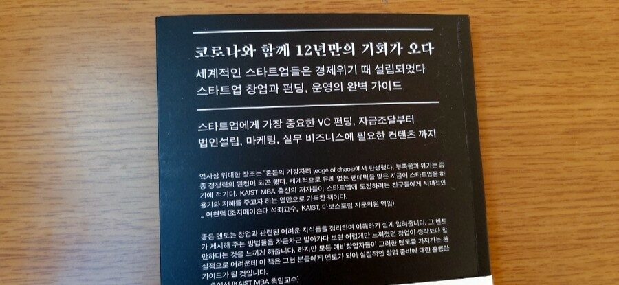 창업에 따르는 투자의 재원마련과 마련과 핵심활동인 비즈니스 변화하는 상황의 마케팅 전략등을 제시하고 혁신과 비전을 만들어야 한다고 적고 있다.초기 스타트업의 공통적인 문제는 돈이다.자금의 조달 방법을 다루고 다양한 정부지원을 소개하고 있다.창업을 하면 대부분 3년을 가지 못하고 문을 닫는다.정부의 자금 지원을 잘 활용하면 3년은 버틸수 있다.코로나와 경기침체는 스타트 업을 꿈꾸는 당신에게는 절호의 기회가 될수 있다고 이 책은 말하고 있다.