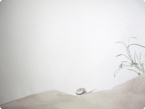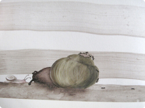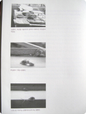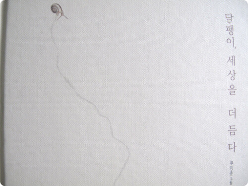 표지가 역시나 파격적이다. 전작 <나는 한 마리 개미>에서도 새하얀 바탕에 정말 실물크기의 개미를 한마리 그녀 두었는데 역시 이번 작품에서도 달팽이 한 마리 그려진 것이 전부이다. 흥미로운 것은 표지 속의 달팽이 한 마리와 그 달팽이가 지나간 흔적이 남은 길은 마음에 드는 표지가 없어서 기르던 달팽이를 백지 위에서 기어가게 하고, 그 족적을 그린 것이라고 한다.