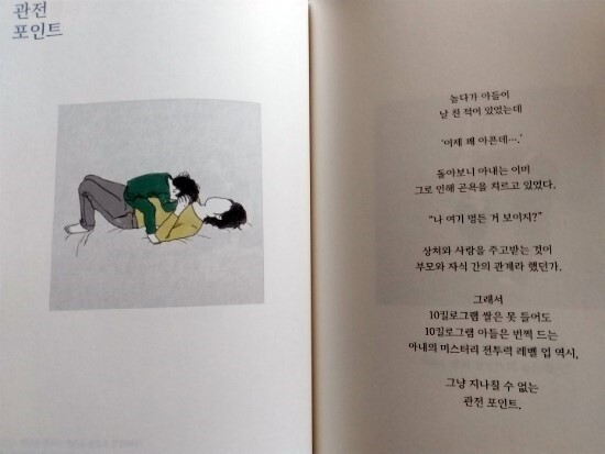 책 곳곳에는 그런 이야기들이 나온다. 아이와 함께 했던 소중한 시간들, 아이로부터 배운 소중한 경험들, 그리고 이 경험이 아니라면 알 수 없었을 아내의 육아 고충, 자신의 부모가 자신을 보면 느꼈을 감정들...