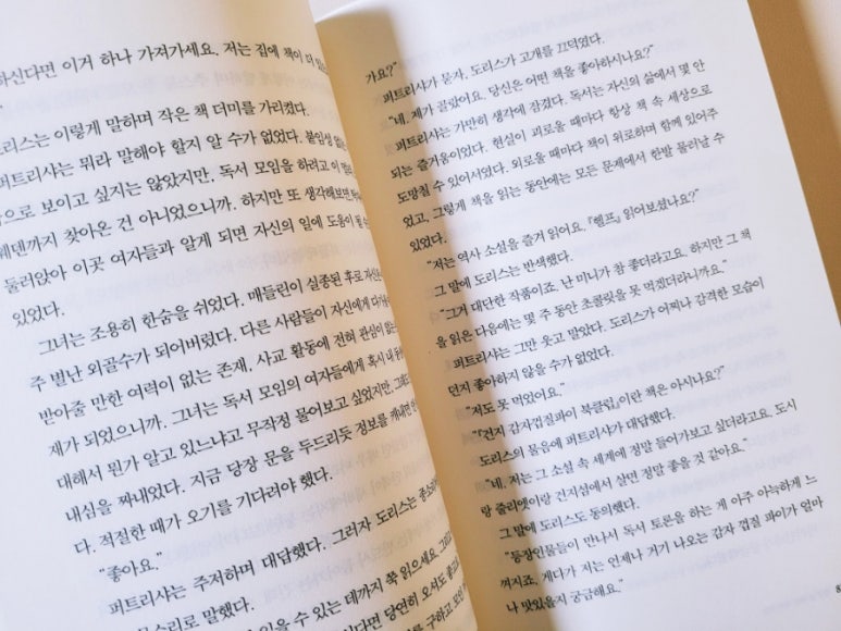 그렇게 도착한 곳에서 퍼트리샤는 자신이 묵고 있는 호텔의 주인이기도 한 모나가 자신의 친구들과 함께 연다는 작은 독서 모임에 초대되어 참여하게 되는데 애초에 스웨덴에 오게 되었던 목적인 여동생의 실종과 관련한 작은 실마리라도 찾을 수 있지 않을까하는 기대감은 어느 덧 온데간데 없어지고 진척이 없는 상황 속에서 퍼트리샤는 좌절과 무력감에 빠져 있었는데 이때 모와 함께 그 작은 독서 모임에 참여하게 된 것이다.