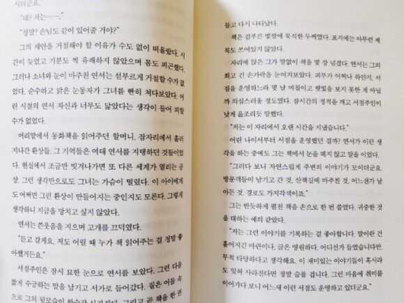 그렇게 또다시 출판사로부터 퇴짜 아닌 퇴짜 같은 조언을 듣고 울컥한 마음에 평소 익숙하던 산을 올라 등산로를 벗어나고 이후 기이한 경험 끝에 절벽에서 죽을 고비를 넘긴다. 그리고 홀연히 나타난 한 남자를 따라 그가 운영한다는 서점으로 향하고 그곳에서 있는 의문스럽지만 귀여운 소녀와 함께 서점 주인이 읽어주는 책 속 이야기를 듣게 된다.