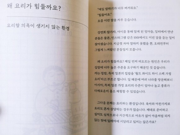 집밥을 좋아하는 사람들이야 많겠지만 막상 자신이 해야 하는 입장이라거나 아니면 너무 집밥만 먹으면 한계에 달하기도 할텐데 이 책에서는 즐거웠던 요리도 의무가 되어버릴 때, 그러니깐 '해야한다'는 의무와 부담으로 다가올 때 얼마나 힘들어지는가에 대해 이야기하고 있기 때문이다.