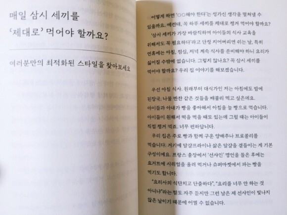 참고로 책에는 본문에 언급된 레시피도 수록되어 있으니 이를 참고해서 요리를 해봐도 좋을것 같다. 그렇기에 이 책은 집밥을 좋아하지만 집밥을 하는 것이 너무 싫은, 이제는 지쳐버린 많은 사람들에게 요리 연구가가 전하는 슬기로운 집밥 생활 노하우라고 할 수 있겠다.