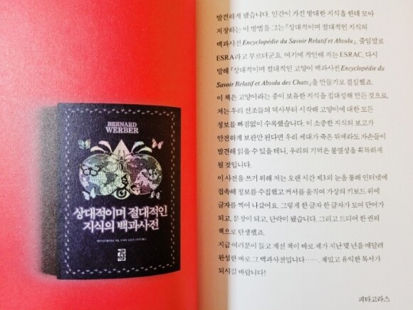 “『상대적이며 절대적인 고양이 백과사전』은 고양이라는 종이 보유한 지식을 집대성해 만든 것으로, 저는 우리 선조들의 역사부터 시작해 고양이에 대한 모든 정보를 빠짐없이 수록했습니다.(p.15)”