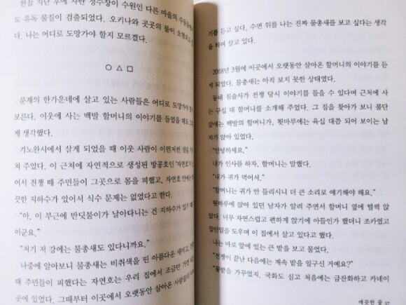 미군의 신기지 건설과 관련해서 SNS에 올린 글이 결국 이 책으로 이어졌는데 남편의 외도와 헤어짐, 그 과정에서 경험한 배신감은 저자를 아끼던 사람들과의 연대로 이겨낸다. 그렇기에 어쩌면 저자가 이 글을 쓸 수 밖에 없었는지도 모른다.
