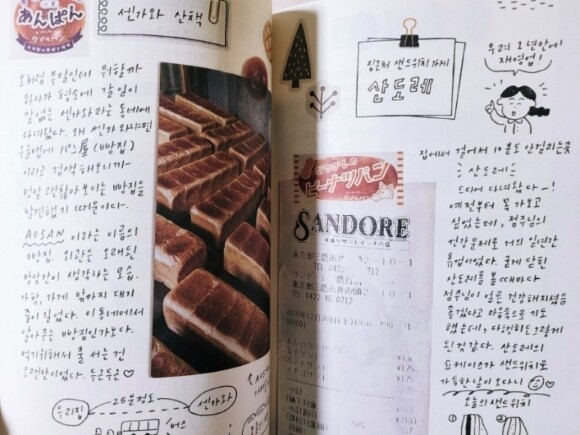 다이어리 형식의 책에는 마치 콜라주 기법을 연상케하는 장면들도 보이는데 오롯이 그림으로만 그려진 페이지도 있지만 사진이나 전단지, 또는 영수증등을 붙이고 그림을 함께 그려넣은 페이지도 있어서 읽는 재미가 더 있는것 같다.