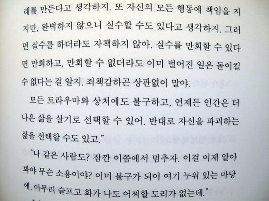 누군가를 사랑한다는 마음이 꼭 상대방에게 가닿지 않아서 마음이 아프기도 하겠지만 사랑하는 그 마음으로 인해 마음 한 켠의 따스함이 느껴지기도 하는 글들이여서, 마치 늦은 밤 어쩌면 새벽녘의 감수성을 더욱 자극하는것 같아 그 즈음 읽어보면 또다른 느낌이 들것 같은 책이며 아울러 글 사이사이 나오는 사진도 글의 감성을 더해줘서 좋았던 책이기도 하다.
