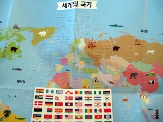 끝으로 위의 사진처럼 세계 지도와 함께 그 위에 해당 국가의 국기를 직접 붙여볼 수 있는 국기 스티커가 부록으로 들어있는데 이는 각 나라의 위치를 다시금 복습해볼 수 있고 나라와 국기를 매칭시키는 놀이로도 활용할 수 있을것 같다.