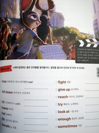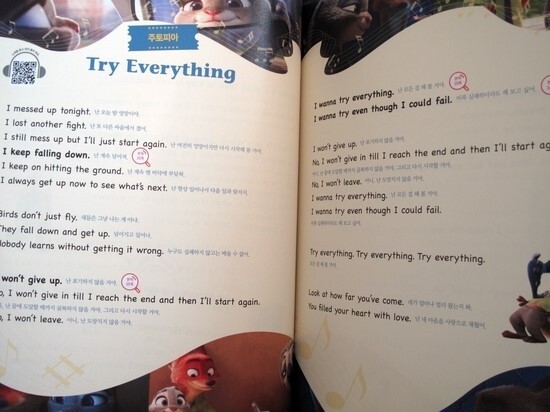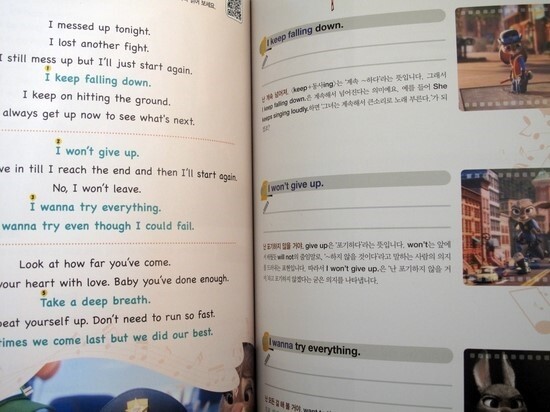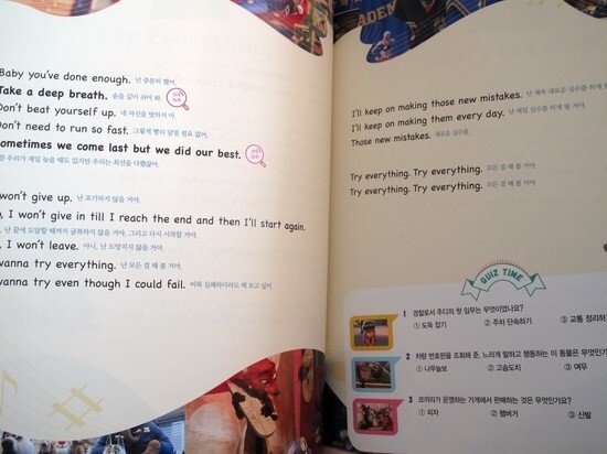 영어 가사와 우리말 번역이 동시에 나오며 노래 가사 중 배워볼만한 표현에 대해서는 본책(Study Book)의 몇 페이지에 있는지를 표시해두었기 때문에 본책과 연계해서 학습을 하면 된다. 각 노래의 마지막에는 'Quiz Time'으로 내용과 관련한 퀴즈를 풀어볼 수 있는 시간도 있으니 아이들과 함께 영화를 먼저 보고 난 다음에 노래도 듣고 또 다른 퀴즈도 만들어서 풀어본다면 더욱 즐거운 시간이 될 것이다.