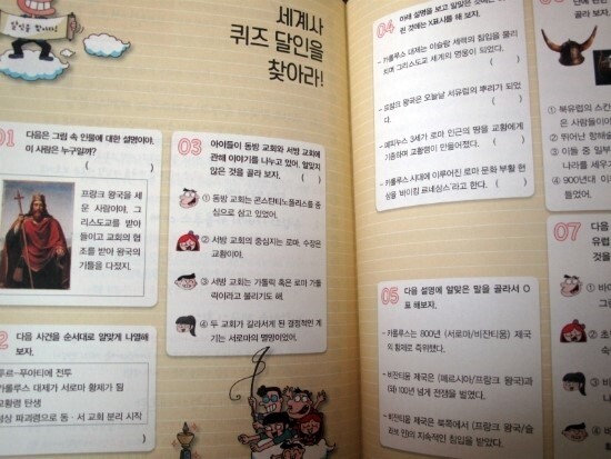 여기에 '용선생 세계사 카페'나 '나선애의 정리노트' 등을 활용해 관련 자료를 추가하거나 내용 정리를 다시 해준다. 각 교시가 끝날 때에는 '세계사 퀴즈 달인을 찾아라!'라는 코너를 통해서 앞서 배운 내용을 퀴즈 형식으로 복습할 수 있도록 해주기 때문에 수업 내용도 흥미진진하겠지만 수업의 마무리도 재미있는 퀴즈로 즐기되 내용을 상기시키는 좋은 구성과 내용으로 만들어진 책이라고 생각한다.