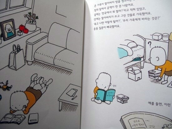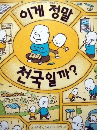 『이게 정말 천국일까?』는 이미 국내에서 『이게 정말 사과일까?』,『이게 정말 나일까?』로 잘 알려진 요시타케 신스케의 작품으로 이야기의 시작은 얼마 전 돌아가신 할아버지의 방을 온 가족이 청소하다가 침대 밑에서 나온 한 권의 공책에서 시작한다.
