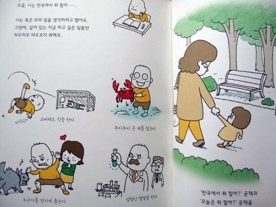죽고나서 그리워하고 무엇인가를 하려고 하기 보다 살아서 그렇게 하면 죽음 이후에는 그 바람이 조금은 덜 안타깝지 않을까 하는 생각이 드는데 이 책의 아이 역시도 할아버지의 공책을 읽고 자신도 천국에서 뭐할까하는 노트를 만들려고 하지만 오히려 살아 있는 지금 하고 싶은 일들만 떠오른다는 말처럼 죽고 나서 무엇을 하겠다는 생각보다 지금 이 순간 살아감에 충실하라는 말이기도 한것 같아 아이처럼 ‘오늘 뭐 할까?’ 공책을 만들어 보는 것도 좋겠다는 생각을 해본다.