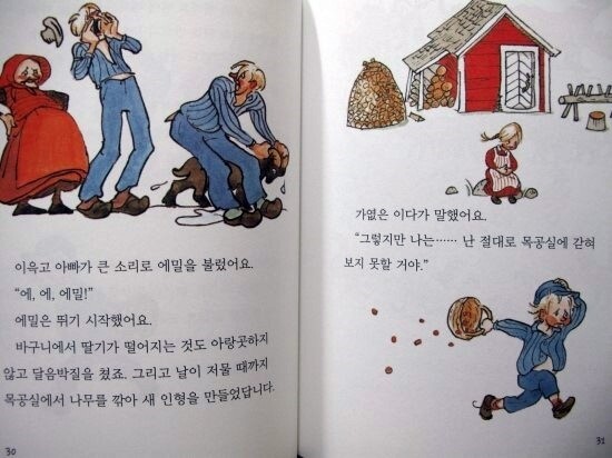 벌로 목공실에 갇혀 나무 조각품을 만드는 오빠의 모습이 하나의 놀이처럼 보여서 말썽 꾸러기인 오빠로부터 장난을 배우고 싶어하는 이다의 모습이 귀엽기도 하고 마침내 그 소원을 이뤘다 싶은 순간 반전 아닌 반전으로 그 꿈을 이루지 못해 상심해 하는 모습 역시도 귀여움을 자아내는 그런 책이다.
