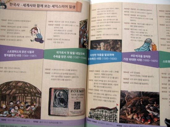 가장 먼저 등장하는 것은 '한국사 · 세계사와 함께 보는 셰익스피어의 일생'인데 역사적으로 셰익스피어의 삶이 어느 시점에 존재했는지에 대해서 또는 시대별 흐름에 따라 그가 어떤 작품을 발표하고 인생에서 어떤 변화를 맞이하는지 등의 굵직굵직한 이야기들이 잘 표시되어 있다.