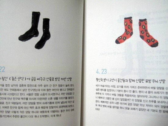 그렇게해서 저자가 딱 1년동안 시행한 1일 1폐 프로젝트의 성과물이 이 책에 담기게 된 것이다. 저자는 가장 흔하고 버리기에 쉬운 양말부터 시작한다. 양말 하나에도 가족과 나의 이야기가 있기에 저자는 그리고 글을 남기고 버린다.