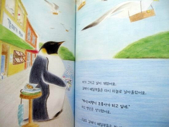 그리고 펭귄은 기대에 부흥하듯 배달일을 너무나 잘해내고 이에 점장님은 오후에 할 일도 맡기려 하지만 비가 그치고 하늘을 나는 갈매기들을 보면서 이제 펭귄은 비행기 조종사가 되고 싶다고 생각하면서 이야기가 끝이난다.