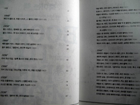 실제로 이 책의 목차를 보면 멀게는 1840년대의 에드거 앨런 포의 작품에서 시작되고 중간중간 아마도 읽어 봤음직한, 아니면 적어도 작품의 제목 정도는 들어봤음직한 책들이 대거 등장하기 때문에 시대를 지나면서 2000년대에 이르기까지 흥미진진한 작품들을 만날 수 있으니 미스터리를 좋아하는 나와 같은 사람들의 경우에 정말 행복해지는 책이 아닐 수 없다.