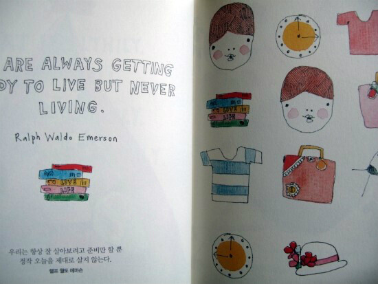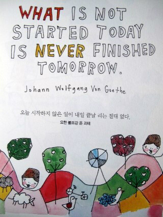 책속의 명언과 잠언은 모두 영어로 적혀 있고 누가 한 말인지에 대한 부분도 영어로 적혀 있다. 그리고 그 아래에는 우리 말로 번역이 되어 있고 글과 관련한 그림이 그려져 있는데 마치 그 자체로도 하나의 작품처럼 느껴지는 그림들이라는 점에서 글을 읽고 난 다음에 그림만 다시 몰아서 봐도 좋을것 같다는 생각이 든다.