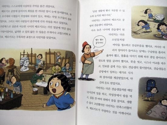 이어서 1452년 이탈리아 피렌체의 북서쪽에 위치한 빈치라는 마을에서 태어난 레오나르도 다빈치 탄생과 그의 집안 이야기, 그의 가족과 성장 과정을 자세히 읽을 수 있다.