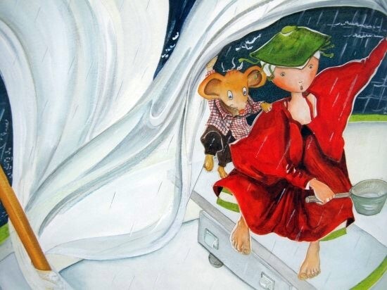 이윽고 회색 구름이 몰려오더니 하늘 전체를 덮고 폭풍우가 몰아친다. 둘이 타고 있는 돛단배가