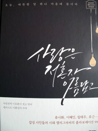 필사를 위한 노트가 따로 있을 정도인데 우리에게 잘 알려진 시를 모아서 이 시를 필사하는 경우도 많은데 『사랑은 저혼자 아름답고』의 경우에는 ‘아침편지’를 연재하는 이호준 작가와 이화선 캘리스트가 만나 탄생시킨 책이다. 책에 실린 글들은 ‘사랑으로 빚은 이호준의 시와 문장’은 물론 동서양의 시인, 문학가, 철학자 등이 전하는 명언과 지혜, 그들의 작품 속 아름다운 문장들 99편이다.