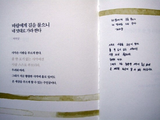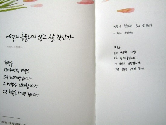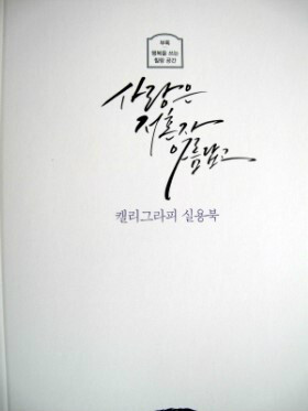 캘리그라피 주변에는 상당한 여백이 존재한다. 그러니 독자들은 왼쪽의 감동적인 글귀를 읽고 난 다음 그 여운을 캘리그라피로 직접 표현해 볼 수 있는 것이다. 이처럼 하드커버로 된 책은 그 안에 좋은 글귀를 담고 필사와 캘리그라피를 동시에 해볼 수 있도록 하고 있기 때문에 1석 3조 그 이상의 매력을 지녔다고 할 수 있겠다.