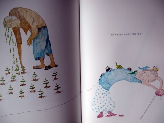 얇은 선으로만 그림을 그리고 색칠을 해놓았고 다소 특이한 표현이 어떤 그림의 경우에는 조금 무섭기도 한게 사실이다. 한편으로 뭔가 평범하지 않은 철학적이고 사색적인 분위기가 물씬 풍기는 글도 이 책의 묘미이다.