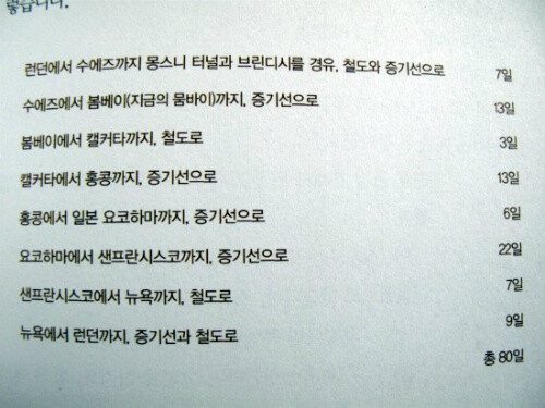 게다가 그 나라의 정보에 대해서도 책으로도 만날 수 있고, 인터넷 검색으로 먼저 그 나라를 다녀 온 이들의 생생한 이야기를 들을 수 있는 지금과는 달리 80일간 여행을 해야 하는 나라에 대한 정보조차도 거의 모르는 나라가 많았을 것이다.