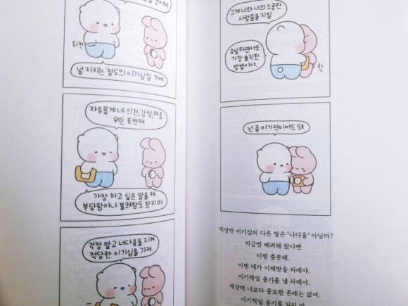 전체적으로 너무나 좋은 말들이 많아서 어디에 밑줄을 긋기도 힘들 정도이다. 그림을 통해 어떤 문제 상황을 제시하고 그 과정에서 힐링곰 꽁달이의 등장시켜 상담과 치료, 위로의 삼박자가 조화를 이루며 이후 다시금 작가님의 정리된 메시지를 전달하는 구성의 책은 연말연시를 앞두고 소중한 사람에게 1순위로 선물하고 싶어지는 그런 책이였다.