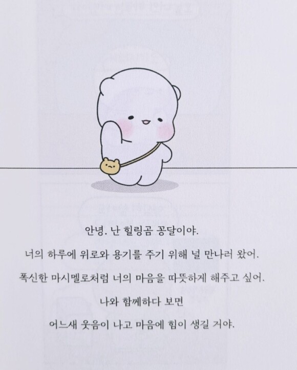 바로 이런 점 때문에 힐링곰 꽁달이라는 캐릭터는 어떻게 보면 작가 자신의 분신이기도 하고 또 작가가 전하는 메세지가 단순한 위로가 아니라 심리상담사라는 전문가의 견해에서 나온 치료와 같은 차원이라고 봐도 좋을것 같기에 더욱 의미있게 다가오는 책이였다.