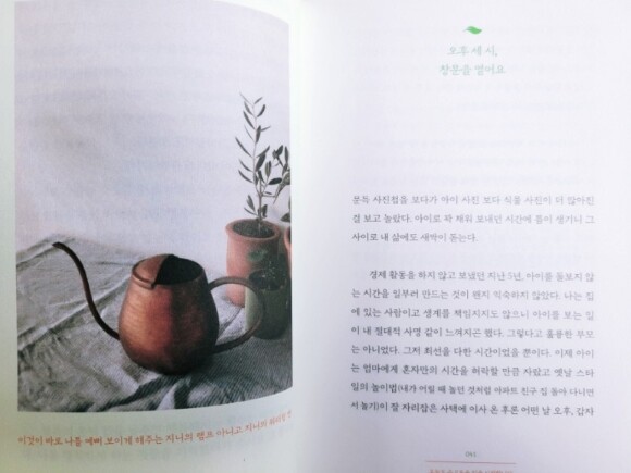 그래서인지 집안에서 식물을 관리하고 어떤 장소에 어떤 식물을 두면 좋을지 등과 관련한 이야기를 책에서 만나볼 수 있는데 이런 점은 집안에 식물을 두고 싶은 사람들이나 막상 들이고 싶어도 관리측면에서 망설여지는 사람들을 위해서 추후 나올 이야기와 정보들을 통해 도움을 받을 수 있을것 같다. 아울러 아이도 어렸을 때부터 식물을 일상에서 식물을 접하니 그렇지 않은 경우보다 자라는 과정에서 좋은 영향을 미치지 않을까 싶은 생각도 든다.