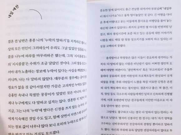 이렇듯 『내밀 예찬』은 내밀함의 비밀스러운 특징을 시작으로 외부와의 관계성, 나아가 이런 성향을 가진 사람의 시선에서 바라 본 외부 세계의 모습 또한 작가님은 담아내기 때문에 단순히 타인과의 관계 단절로 받아들일 것이 아니라 한편으로는 다양성을 한 모습으로서 취향 존중이 아닌 성향 존중을 바라는 이야기일것도 같아 더욱 공감갔던 이야기다.