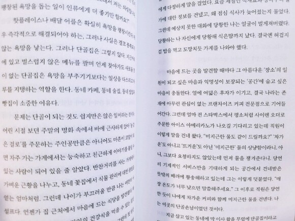 아마도 이런 마음이 들었던 사람들 있을 것이다. 은근히 혼자 있어도 문제가 되지 않았고 이상하게 보이지 않았던 시기였다. 그리고 그 시기를 지나면서 그런 문화는 지속되어 왔고 그런 상황에 있었던 작가님의 이야기는 개인적인 시간, 개인적인 공간의 확보에 대해 이야기하며 완전히 고립된 상황을 좋아하는게 아니지만 홀로 있는 시간을 좋아한다는 것에 대해 책을 통해 보여준다.