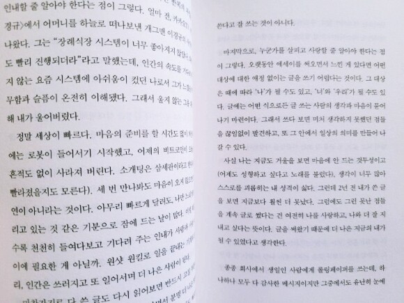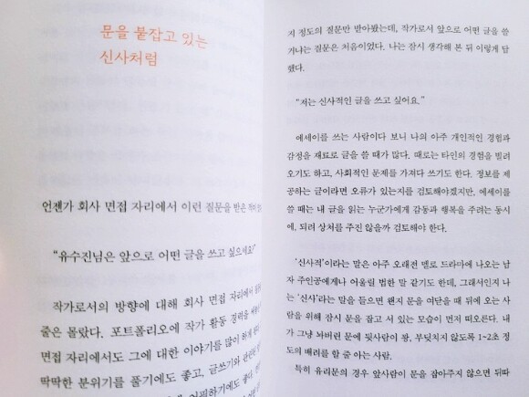 문득 이 글을 보면서 글을 쓰는 일은 어떨까 싶어진다. 괜히 나도 한번 써볼까 싶어지는 그런 마음이 든다. 누군가에게 보여주진 않을지라도 나의 일상을 좀더 기록으로 남겨보고픈 마음도 드는 책이다. 그러면 그냥 지나칠 일도 다양한 에피소드로 남겨지지 않을까 싶은. 자신의 인생을 좀더 애정어린 시선으로 대할 수 있는 일을 찾아 그렇게 다른 이들의 기준이 아닌 나 답게 쓰는 날들로 나의 시간들을 채워보고 싶어진다.