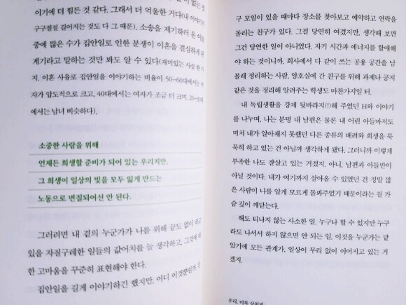 혼자 견디면, 나 하나만 찾으면 괜찮을거라 생각을 이 책을 보면서 많은 사람들이 한다는 것을 알게 되는데 그중에는 요즘 많이 언급되는 가스라이팅처럼 주변에서 그런 상태를 은근히 강요하는 경우도 있겠지만 스스로가 그래야 한다고 생각했던 경우도 분명 있는데 그러다 결국 더이상 그랬봤자 아무것도 달라지지 않는다는 것을 깨닫는 순간 이 사람들은 이별을 결심하고 변호사님을 찾아오는 것이다.