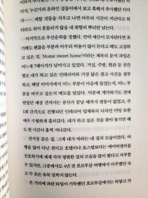 자취하는 친구 집에 가서 친구의 집, 여행 동안 마주한 순간들에서 얻은 영감들... 그 모든 순간들 속에서 만약 내 집을 갖게 되면 어떻게 꾸밀 것이라는 자신만의 스타일을 만들어 갔고 그것을 단순히 생각에만 그치는 것이 아니라 현실적인 노력으로 실현시킨 작가님의 이야기를 담은 책이기도 해서 다시 한번 멋진 분이라고 생각한다.