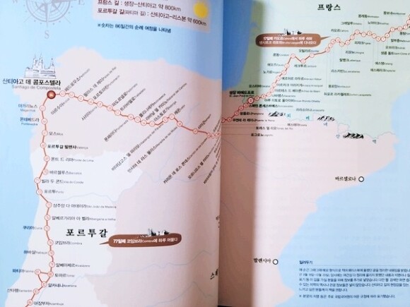 책에서는 구체적으로 이 2200km의 이정표와도 같은 여정을 지도에 표시하고 있는데 프랑스에서 시작해서 보통 순례자들이 순례증서를 받게 되는 산티아고 데 콤포스텔라에 도착하는것 까지는 이해가 되는데 저자는 여기서 한걸음 더 나아가 포르투갈의 리스본에서 86일간의 여정을 마무리한다는 점이 특이하다.