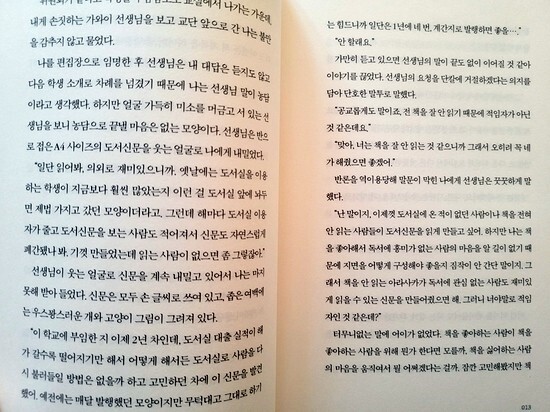 작품 속 대화를 보면 도서실 대출 실적이 저조하자 선생님이 도서실로 사람을 불러들일 방법을 찾게 되고 이와 관련해서 임무를 수행할 적임자를 찾던 중 '나'라는 인물이 거론된다. 아이러니하게도 나는 책을 잘 읽지 않기 때문에 적임자가 아니라고 말하지만 오히려 그렇기에 더 적임자라는 선생님의 되치기에 꼼짝없이 당하게 된 주인공, 과연 선생님의 선택은 적중했을까?