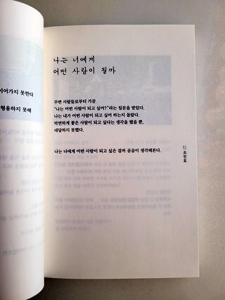 어떤 형식에 얽매이지 않고 자유롭게 쓰여진 삼행시도 실려 있는데 아무래도 사랑에 대한 시가 많아보이기도 한다. 아무래도 시가 주는 이미지도 이런 사랑과도 밀접한 관련이 있어서일테지만 개인적으로는 위의 사진 속 이미지처럼 나 스스로에 대해 생각해보게 만드는 글이 좋다.