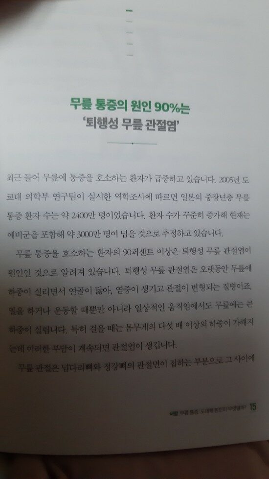 연골이 닳아서 섬유화가 나타나는 현상은 무릎 통증을 부추기는 상황이다. 요즘 들어서 ,무릎 관절에 좋은 글로코사민을 섭취하는 이들ㅇ니 많아지고 있다 . 하지만, 무릎 뼈라 갑자기 좋아지지 않는 이유는 여기에 있다. 내 몸의 근육을 강화시켜서, 무릎으로 향하는 통증을 분산시키는 요법이 필요하다. 직업적으로 다리와 발을 많이 쓰는 직업일수록 무릎에 이상이 나타나는 경우가 많고, 교통사고나, 마라톤, 등산으로 무리한 운동을 할 때, 무릎에 통증이 심해질 수 있다. 작가는 바로 이 부분을 문제로 삼고 있다. 무릎 건강은 내 몸의 건강에 직결될 수 있고, 섬유화를 방치하면, 무릎 뼈 뿐만 아니라,다른 부위의 뼈에 이상을 가중시킬 수 있기 때문에,적제적소에 내 몸에 대한 이상 증세를 체크하면서, 건강한 생활습관을 만드는 것이 먼저 선행되어야 한다.