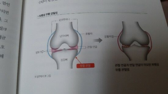무릎 관절은 넙다리뼈와 정강이뼈의 접하는 부분으로 그 사이에는 쿠션 역할을 담당하는 관절 연골과 반달 연골이라 불리는 연골 조직이 있습니다. 관절 연곮과 반달 연골은 세월이 흐를 수록 조금씩 닳는데 , 깍인 연골 조각이 관절주머니 안쪽의 윤활막을 자극합니다. 윤활막이 자극되면 우리 몸은 연골 조각을 외부의 적으로 인식해 면역 반응을 일으킵니다. (-16-)