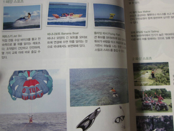 해양스포츠로 제트스키는 물론, 바나나 보트 ,플라잉 피시,페러세일링~ 육상에서 하는 짚라인, 버그카...요런건 우리나라에서도 종종 하잖아요. 이보다는 역시 스노쿨링이나 스쿠버다이빙, 요트 세일링이 궁금하네요.
