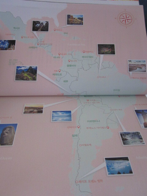 한눈에 남미 대륙이 눈에 들어오고 나라의 위치와 특징적인 여행지의 사진이 함께 소개되어서