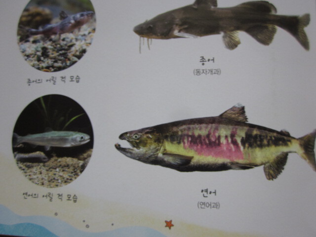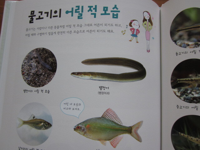 물고기의 어릴적 모습과 다 큰 모습을 비교하는 페이지가 있어요. 커서 모습이 완전히 달라지는 물고기도 있네요. 치어들의 모습은 많이 비슷한 거 같아요.