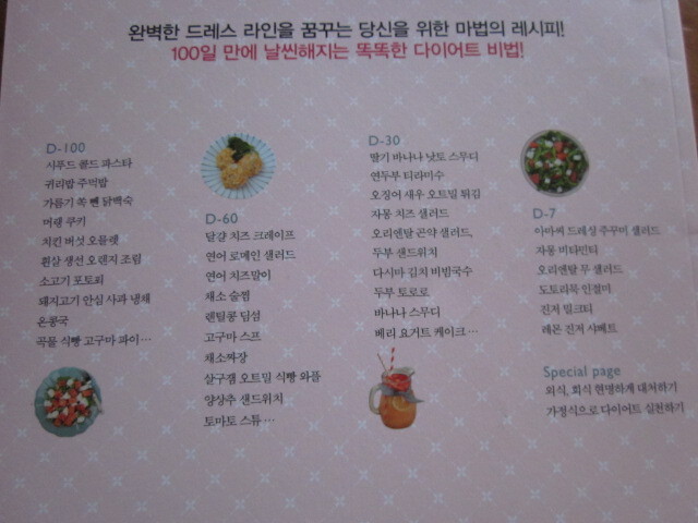 목차를 살피면 100일전, 60일전, 30일전, 7일전으로 나누어 레시피를 소개하고 있답니다.